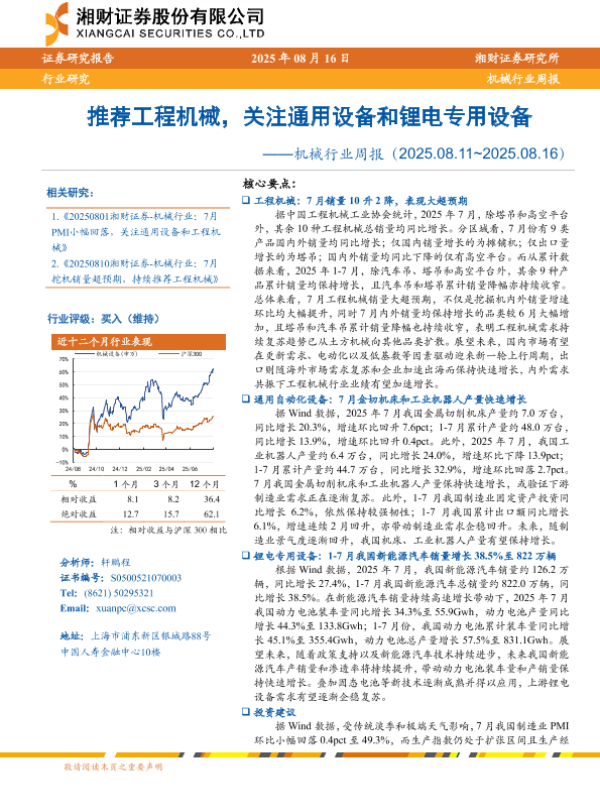 【湘财证券】【20250816】工程机械-推荐工程机械,关注通用设备和锂电专用设备-16页 证券期货研究报告
