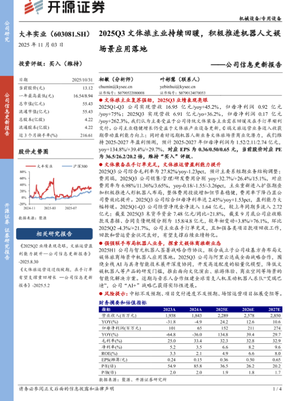 【开源证券】【202511】2025Q3文体旅主业持续回暖,积极推进机器人文娱场景应用落地-4页 证券期货研究报告
