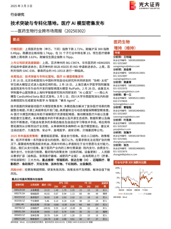 【光大证券】【20250303】医药生物行业跨市场周报:技术突破与专科化落地,医疗AI模型密集发布-15页 行业研究
