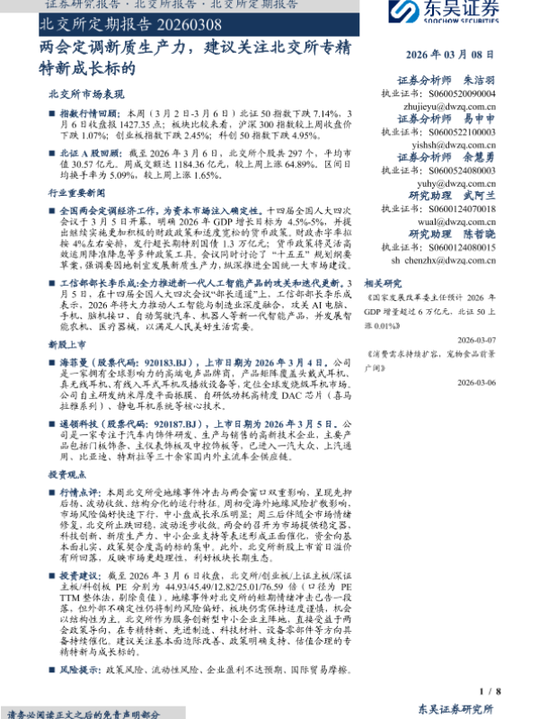 【东吴证券】【202603】两会定调新质生产力,建议关注北交所专精 特新成长标的-8页 证券期货研究报告
