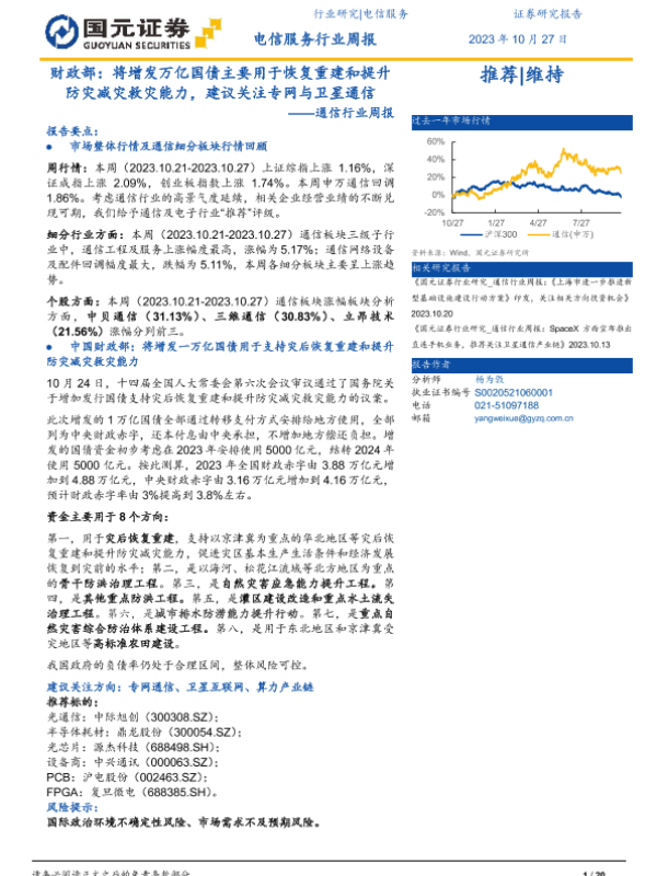 【国元证券】【20231027】通信行业周报:财政部:将增发万亿国债主要用于恢复重建和提升防灾减灾救灾能力,建议关注专网与卫星通信-20页 行业研究