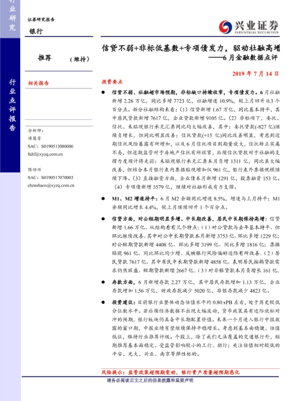 【兴业证券】【20190714】6月金融数据点评-信贷不弱+非标低基数+专项债发力,驱动社融高增-6页 行业研究