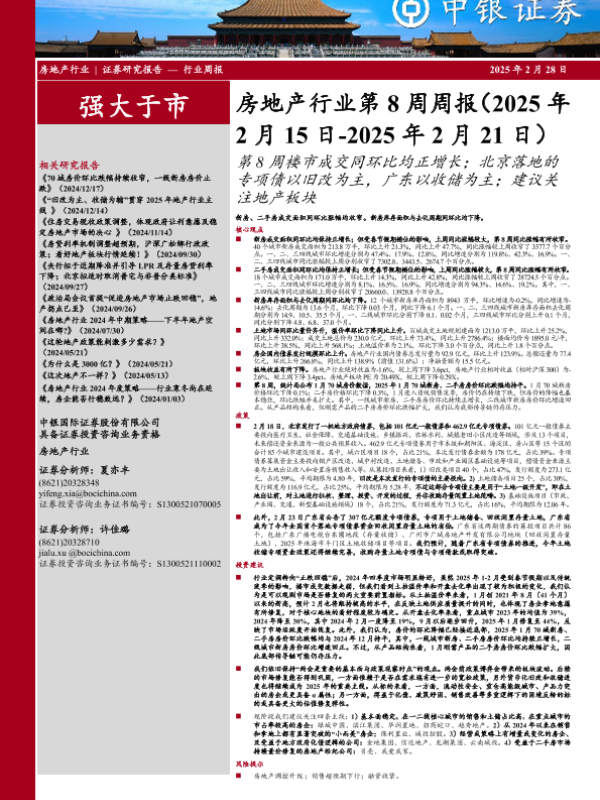 【中银证券】【20250228】房地产行业第8周周报:第8周楼市成交同环比均正增长;北京落地的专项债以旧改为主,广东以收储为主;建议关注地产板块-25页 行业研究