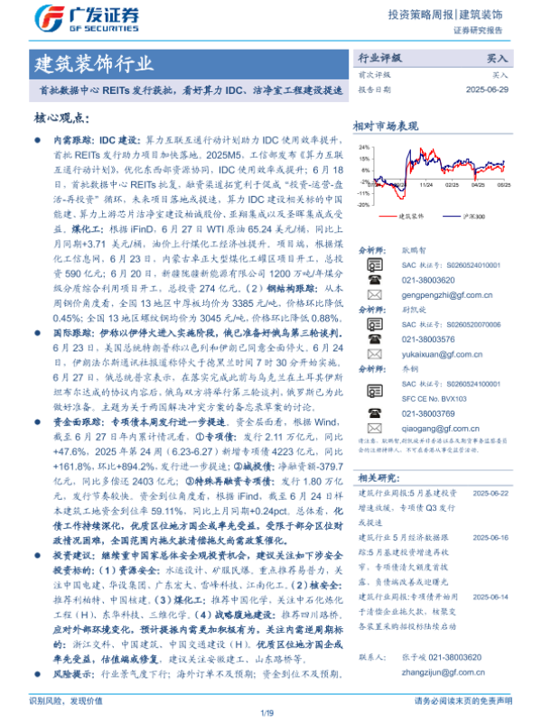 【广发证券】【20250629】建筑装饰行业投资策略周报:首批数据中心REITs发行获批,看好算力IDC、洁净室工程建设提速-19页 证券期货研究报告