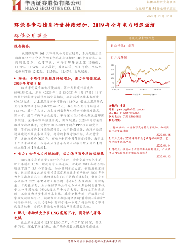 【华西证券】【20200119】环保公用事业行业研究周报:环保类专项债发行量持续增加,2019年全年电力增速放缓-15页 行业研究