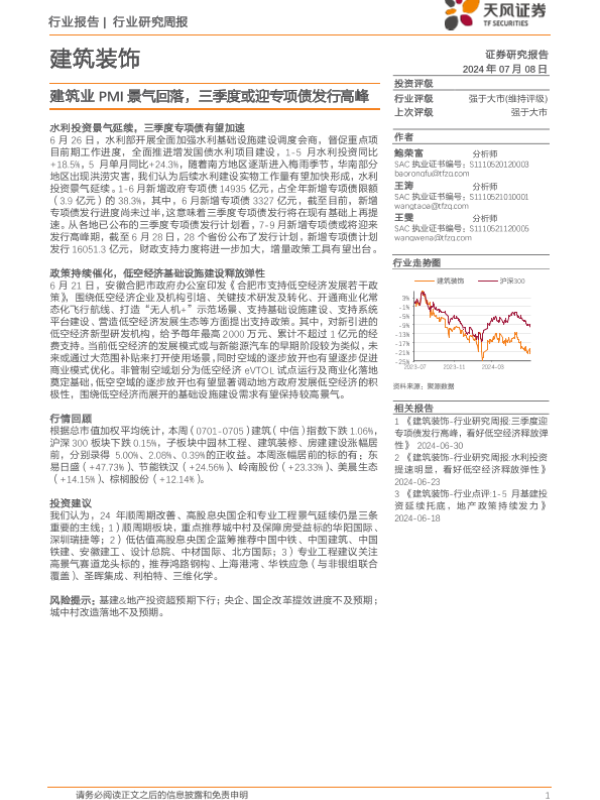 【天风证券】【20240708】建筑装饰行业研究周报:建筑业PMI景气回落,三季度或迎专项债发行高峰-10页 行业研究