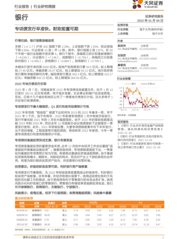 【天风证券】【20220109】银行行业研究周报:专项债发行早准快,财政前置可期-18页 行业研究