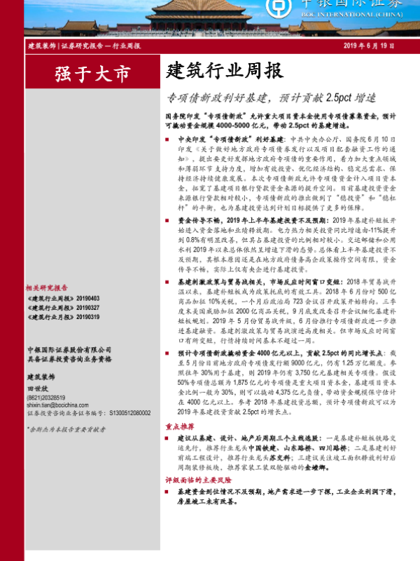 【中银证券】【20190619】建筑行业周报:专项债新政利好基建,预计贡献2.5pct增速-15页 行业研究