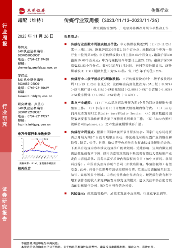【东莞证券】【20231126】传媒行业双周报:微短剧监管加码,广电总局将再次开展专项整治工作-12页 行业研究