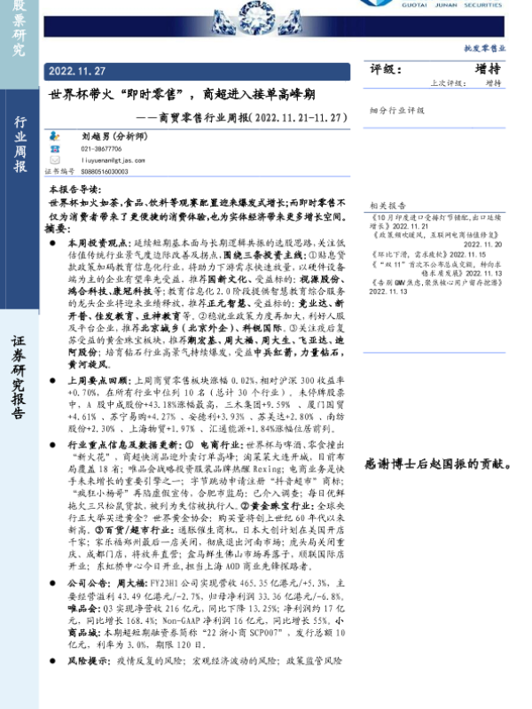 【国泰君安证券】【20221127】商贸零售行业周报:世界杯带火“即时零售”,商超进入接单高峰期-10页 行业研究