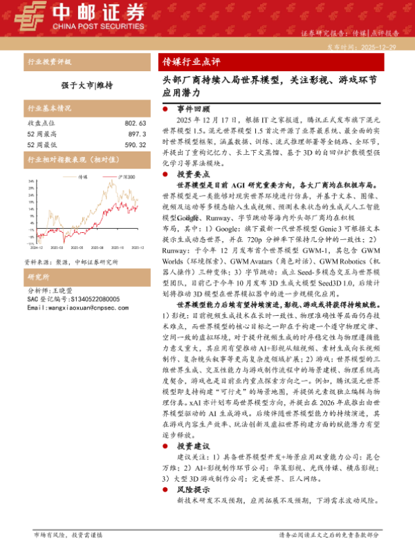 【中邮证券】【202512】传媒行业点评:头部厂商持续入局世界模型,关注影视、游戏环节应用潜力-3页 证券期货研究报告
