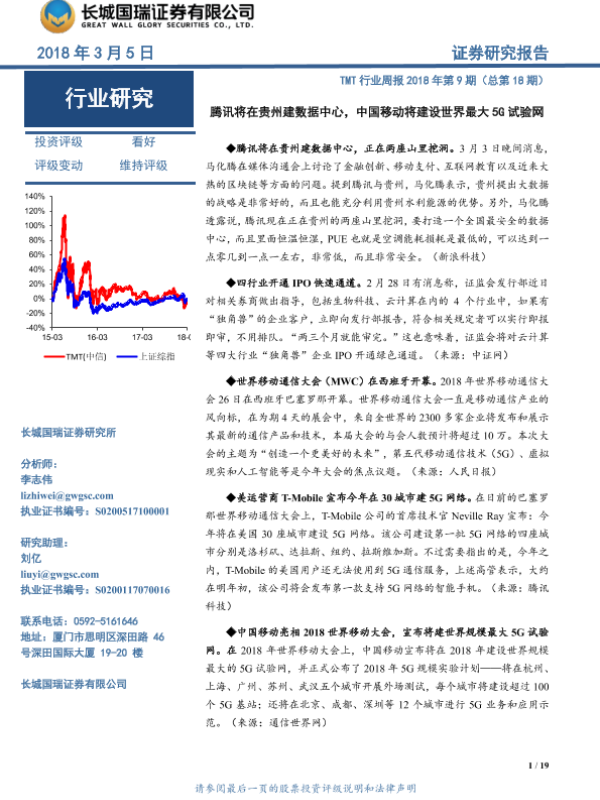 【长城国瑞证券】【20180305】2018年03月05日更新-长城国瑞证券-TMT行业周报2018年第9期(总第18期):腾讯将在贵州建数据中心,中国移动将建设世界最大5G试验网-19页 行业研究