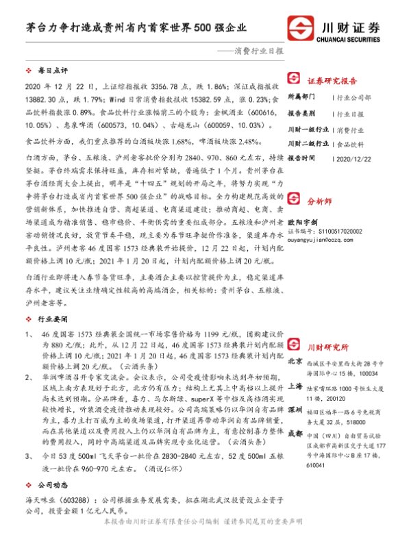 【川财证券】【20201222】消费行业日报:茅台力争打造成贵州省内首家世界500强企业-3页 行业研究
