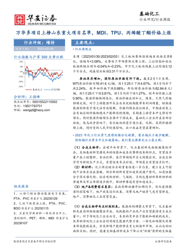 【华安证券】【20230205】基础化工行业周报:万华多项目上榜山东重大项目名单,MDI、TPU、丙烯酸丁酯价格上涨-42页 行业研究
