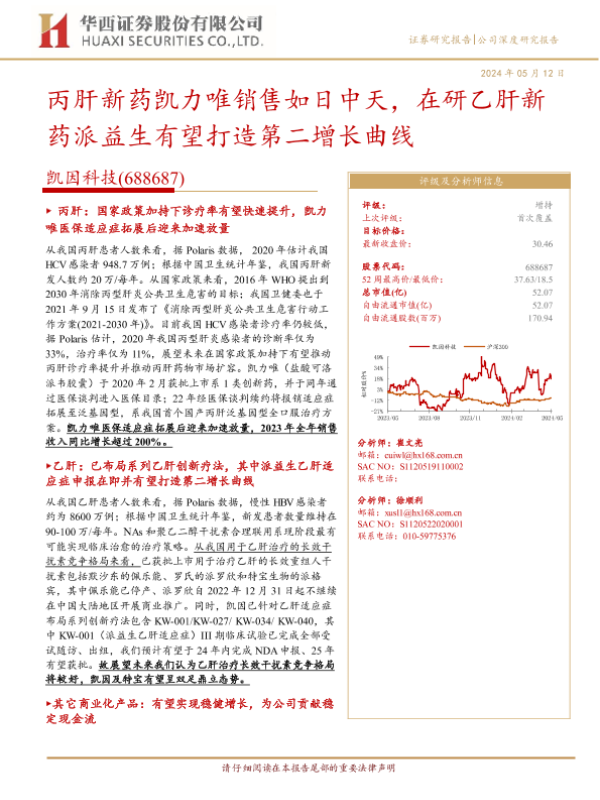 【华西证券】【20240512】凯因科技(688687)丙肝新药凯力唯销售如日中天,在研乙肝新药派益生有望打造第二增长曲线-36页 行业研究