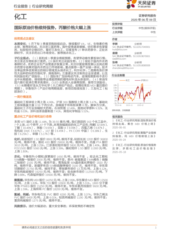 【天风证券】【20200609】20200609-天风证券-化工行业研究周报:国际原油价格维持强势,丙酮价格大幅上涨-16页 行业研究