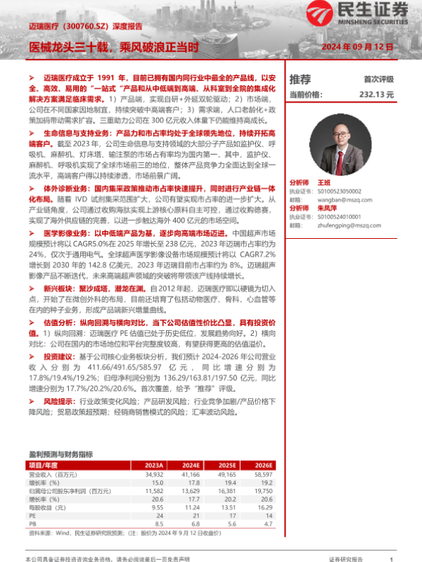【民生证券】【20240912】迈瑞医疗(300760)深度报告:医械龙头三十载,乘风破浪正当时-35页 行业研究