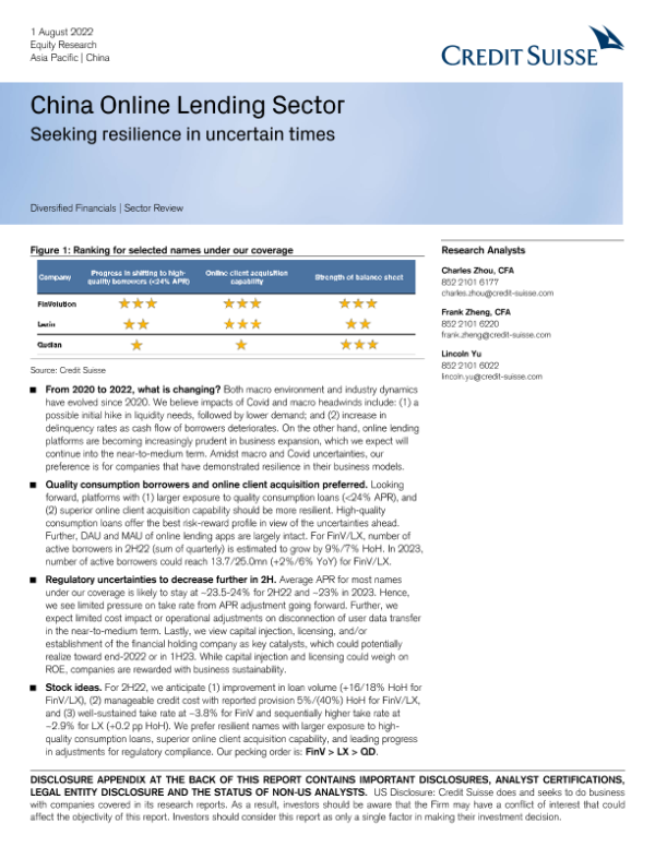 【Credit Suisse】【20220801】China Online Lending Sector Seeking resilience in uncertain times-33页 行业研究