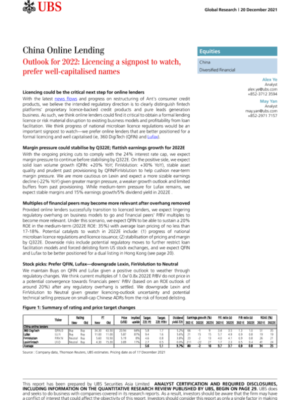 【瑞银】【20211220】瑞银-中国网贷行业-2022年展望:授权一个路标来观察,更喜欢大写的名字-38页 行业研究