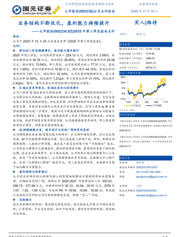 【国元证券】【202511】大华股份(002236.SZ)2025年第三季度报告点评:业务结构不断优化,盈利能力持续提升-4页 证券期货研究报告