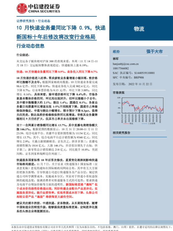 【中信建投证券】【20221122】20221122-中信建投-物流行业动态:10月快递业务量同比下降0.9%,快递新国标十年后修改将改变行业格局-25页 行业研究