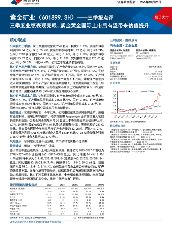 【国信证券】【202510】优于大市 紫金矿业(601899.SH)——三季报点评 三季度业绩表现亮眼,紫金黄金国际上市后有望带来估值提升-8页 证券期货研究报告
