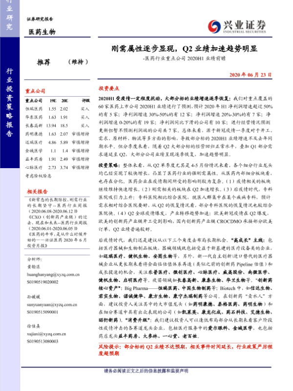 【兴业证券】【20200623】医药行业重点公司2020H1业绩前瞻:刚需属性逐步显现,Q2业绩加速趋势明显-11页 行业研究