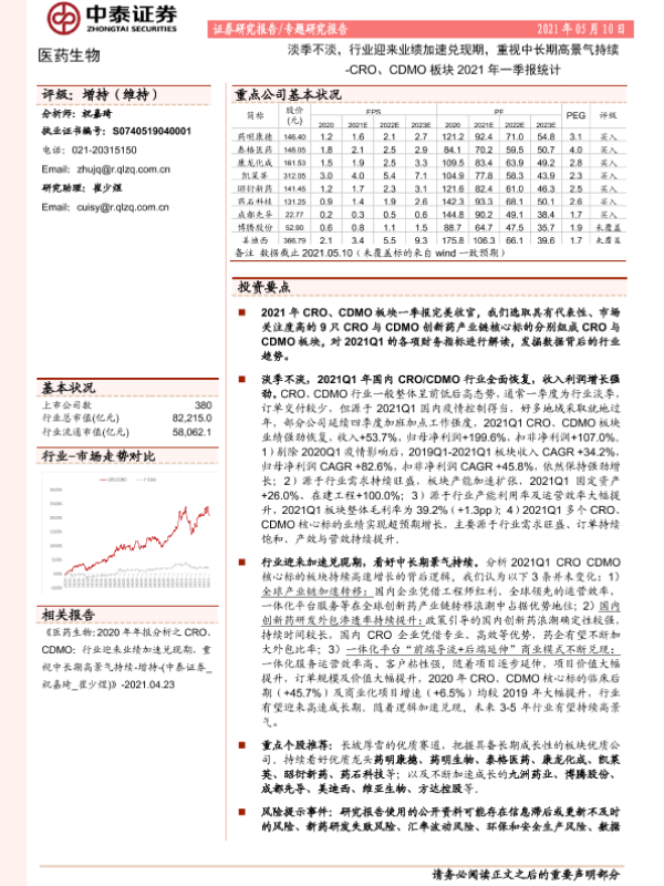 【中泰证券】【20210510】CRO、CDMO板块2021年一季报统计-淡季不淡,行业迎来业绩加速兑现期,重视中长期高景气持续-13页 行业研究