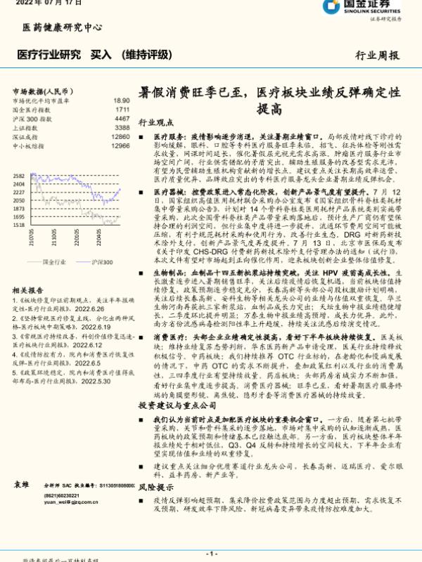 【国金证券】【20220717】暑假消费旺季已至,医疗板块业绩反弹确定性提高-11页 行业研究
