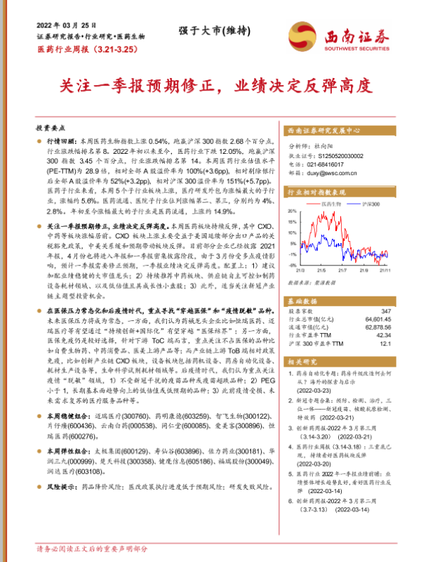 【西南证券】【20220325】医药行业周报:关注一季报预期修正,业绩决定反弹高度-42页 行业研究
