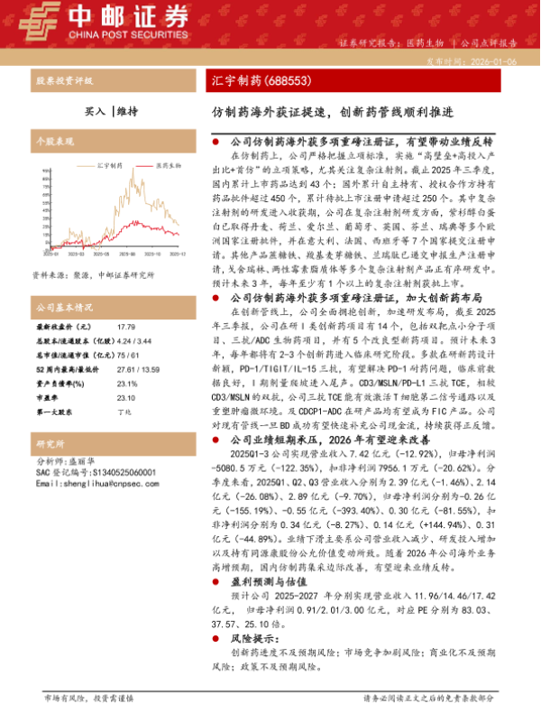 【中邮证券】【202601】仿制药海外获证提速,创新药管线顺利推进-5页 证券期货研究报告
