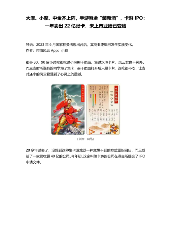 【市值风云 App】【2023】大摩、小摩、中金齐上阵,手游氪金“装新酒”,卡游IPO:一年卖出22亿张卡,未上市业绩已变脸-10页 行业研究