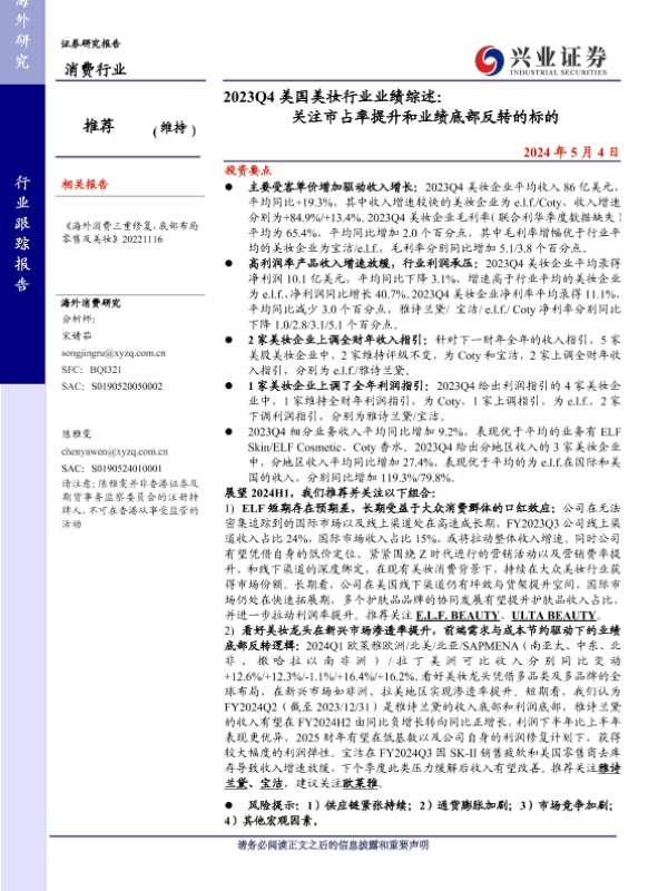 【兴业证券】【20240504】2023Q4美国美妆行业业绩综述:关注市占率提升和业绩底部反转的标的-11页 行业研究