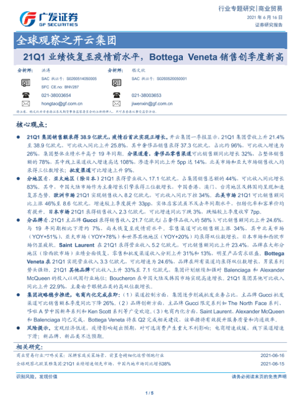【广发证券】【20210616】商业贸易全球观察之开云集团:21Q1业绩恢复至疫情前水平,Bottega Veneta销售创季度新高-5页 行业研究