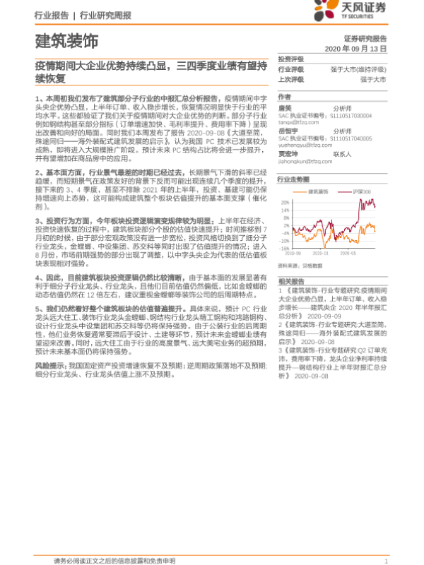 【天风证券】【20200913】建筑装饰行业研究周报:疫情期间大企业优势持续凸显,三四季度业绩有望持续恢复-3页 行业研究