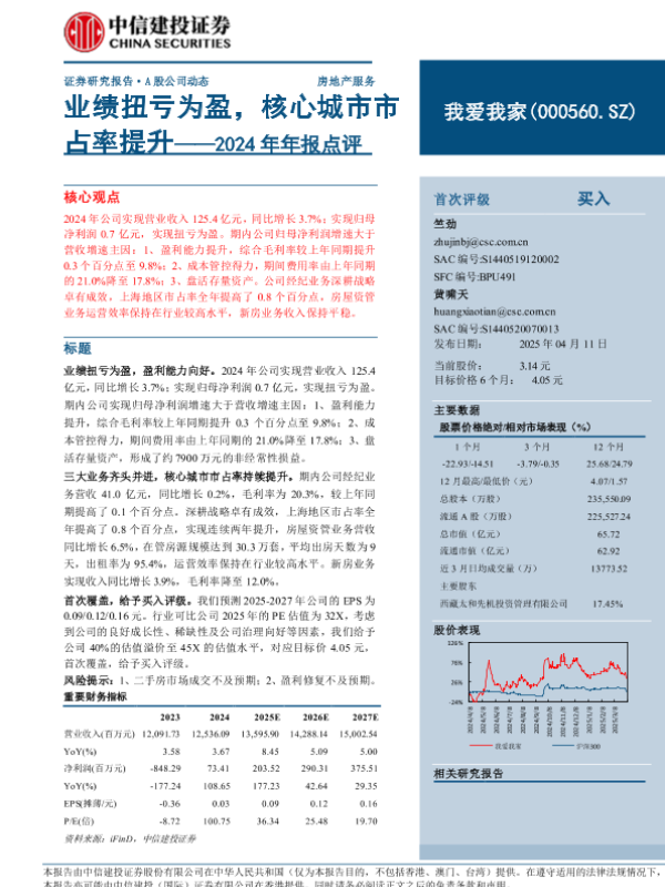 【中信建投证券】【20250411】我爱我家(000560)2024年年报点评:业绩扭亏为盈,核心城市市占率提升-10页 证券期货研究报告