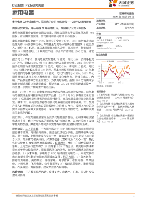 【天风证券】【20230322】家用电器23W12周度研究:奥马电器22年业绩扭亏,拟回购子公司49%股权-14页 行业研究