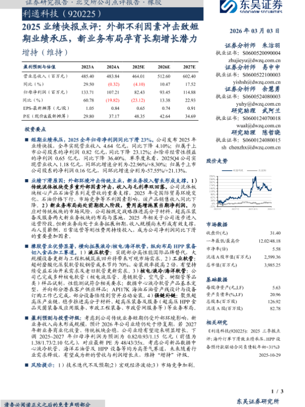 【东吴证券】【202603】2025业绩快报点评:外部不利因素冲击致短期业绩承压,新业务布局孕育长期增长潜力-3页 证券期货研究报告
