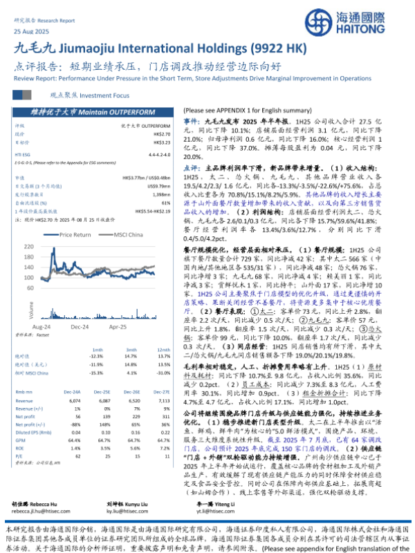 【海通国际】【202508】九毛九(09922.HK)点评报告:短期业绩承压,门店调改推动经营边际向好-12页 证券期货研究报告