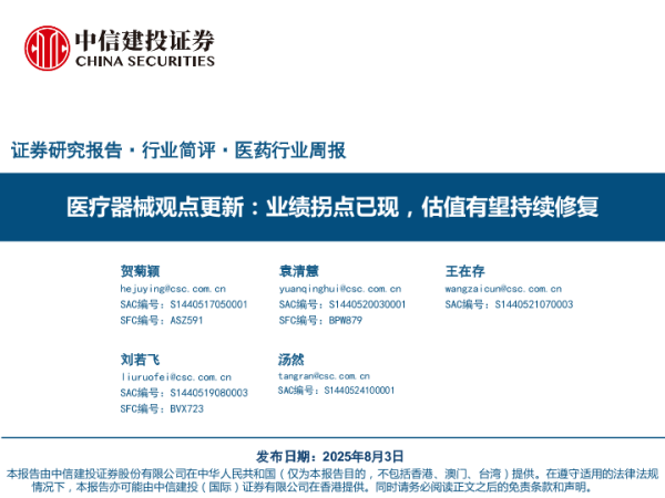 【中信建投证券】【202508】医疗器械观点更新:业绩拐点已现,估值有望持续修复-27页 证券期货研究报告