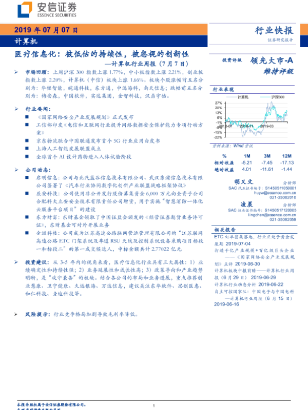 【安信证券】【20190707】20190707-安信证券-计算机行业周报:医疗信息化:被低估的持续性,被忽视的创新性-15页 行业研究