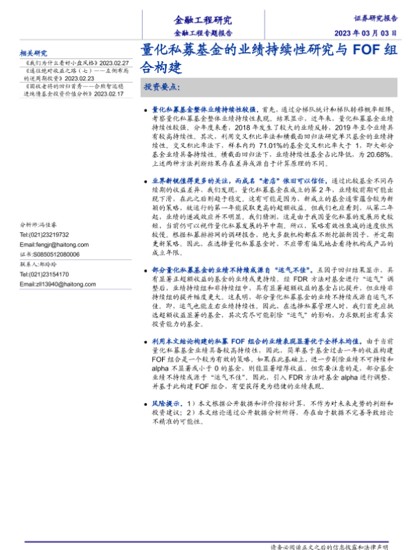 【海通证券】【20230303】金融工程专题报告:量化私募基金的业绩持续性研究与FOF组合构建-22页 行业研究