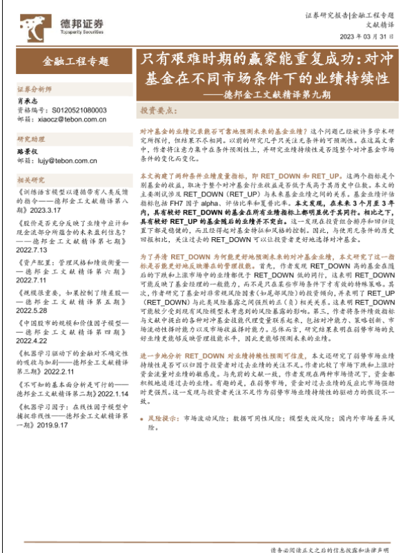 【德邦证券】【20230331】只有艰难时期的赢家能重复成功:对冲基金在不同市场条件下的业绩持续性-21页 行业研究