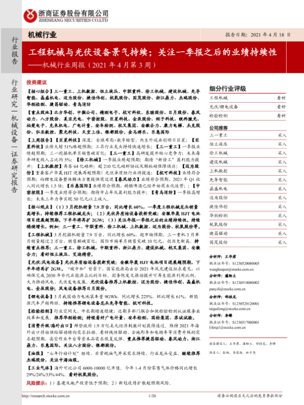 【浙商证券】【20210418】机械行业周报(2021年4月第3周):工程机械与光伏设备景气持续;关注一季报之后的业绩持续性-20页 行业研究