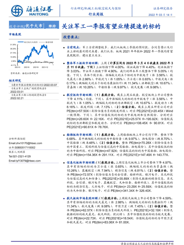 【海通证券】【20220314】20220314-海通证券-航空航天与国防行业周报:关注军工一季报有望业绩提速的标的-4页 行业研究