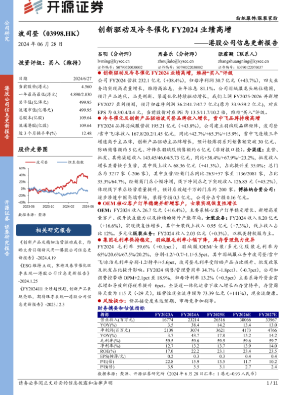 【开源证券】【20240628】波司登(03998.HK)港股公司信息更新报告:创新驱动及冷冬催化FY2024业绩高增-11页 行业研究