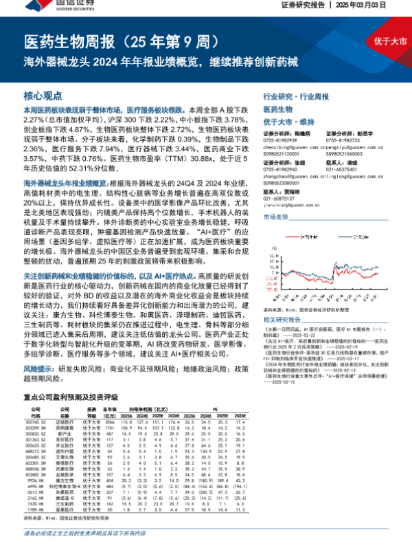 【国信证券】【20250303】医药生物行业周报(25年第9周):海外器械龙头2024年年报业绩概览,继续推荐创新药械-25页 行业研究