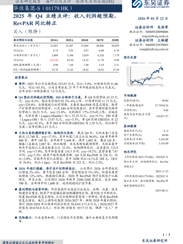 【东吴证券】【202603】2025年 Q4业绩点评:收入利润超预期, RevPAR同比转正-3页 证券期货研究报告