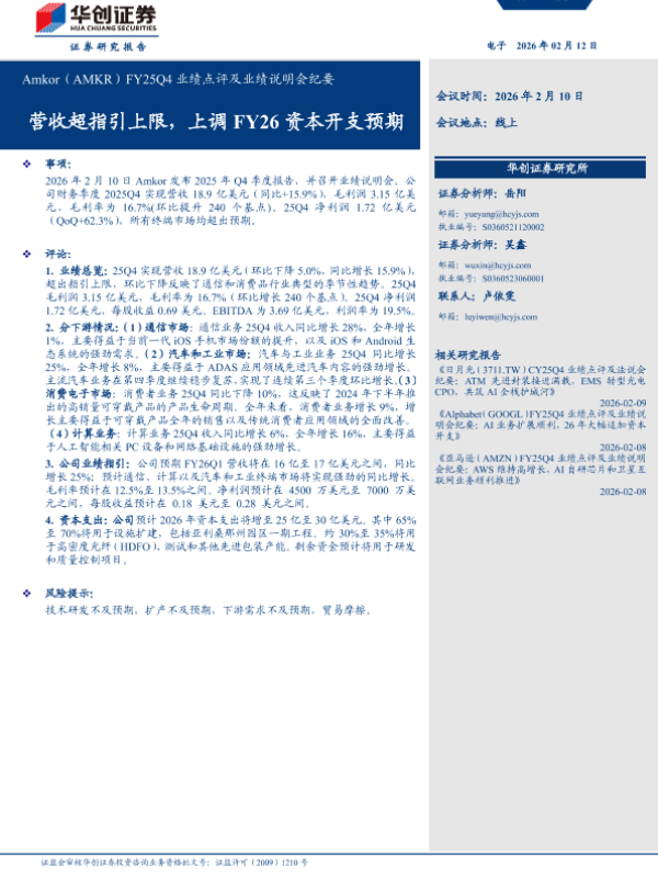 【华创证券】【202602】营收超指引上限,上调FY26资本开支预期:Amkor(AMKR)FY25Q4业绩点评及业绩说明会纪要-11页 会议纪要