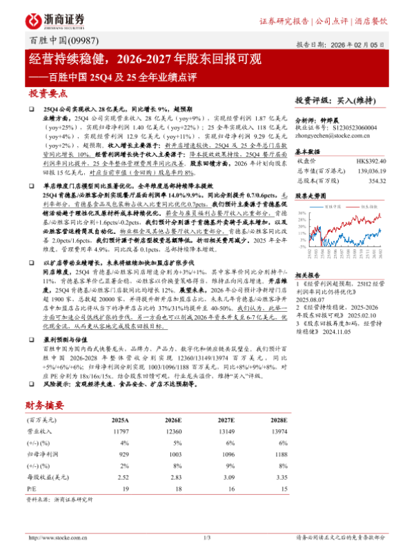 【浙商证券】【2025】经营持续稳健,2026-2027年股东回报可观——百胜中国 25Q4及 25全年业绩点评-3页 证券期货研究报告
